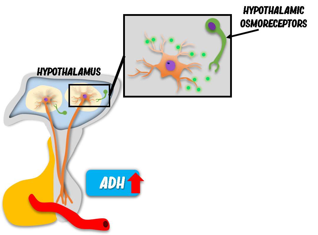 In dehydration, hypothalamic osmoreceptors detect increased plasma osmolality. Additionally, angiotensin II stimulates ADH release. The posterior pituitary secretes antidiuretic hormone (ADH), also called vasopressin.