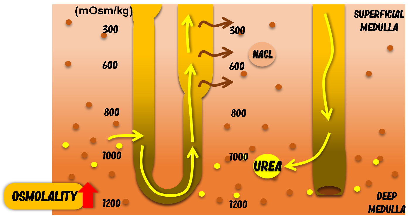 For animals to generate concentrated urine, the renal medullary interstitium must be hypertonic. The deeper the medulla, the higher the osmolality. In many mammals: